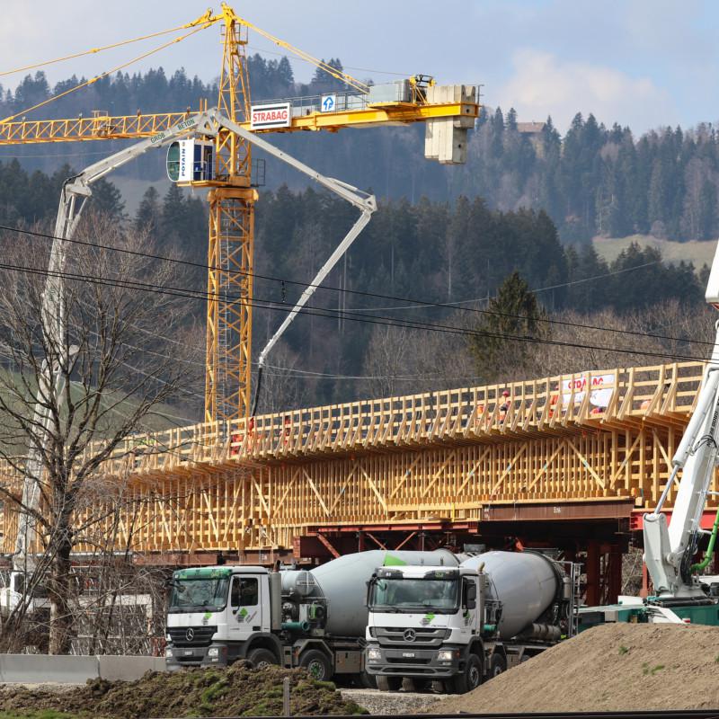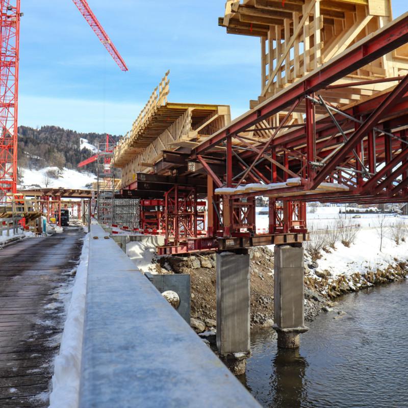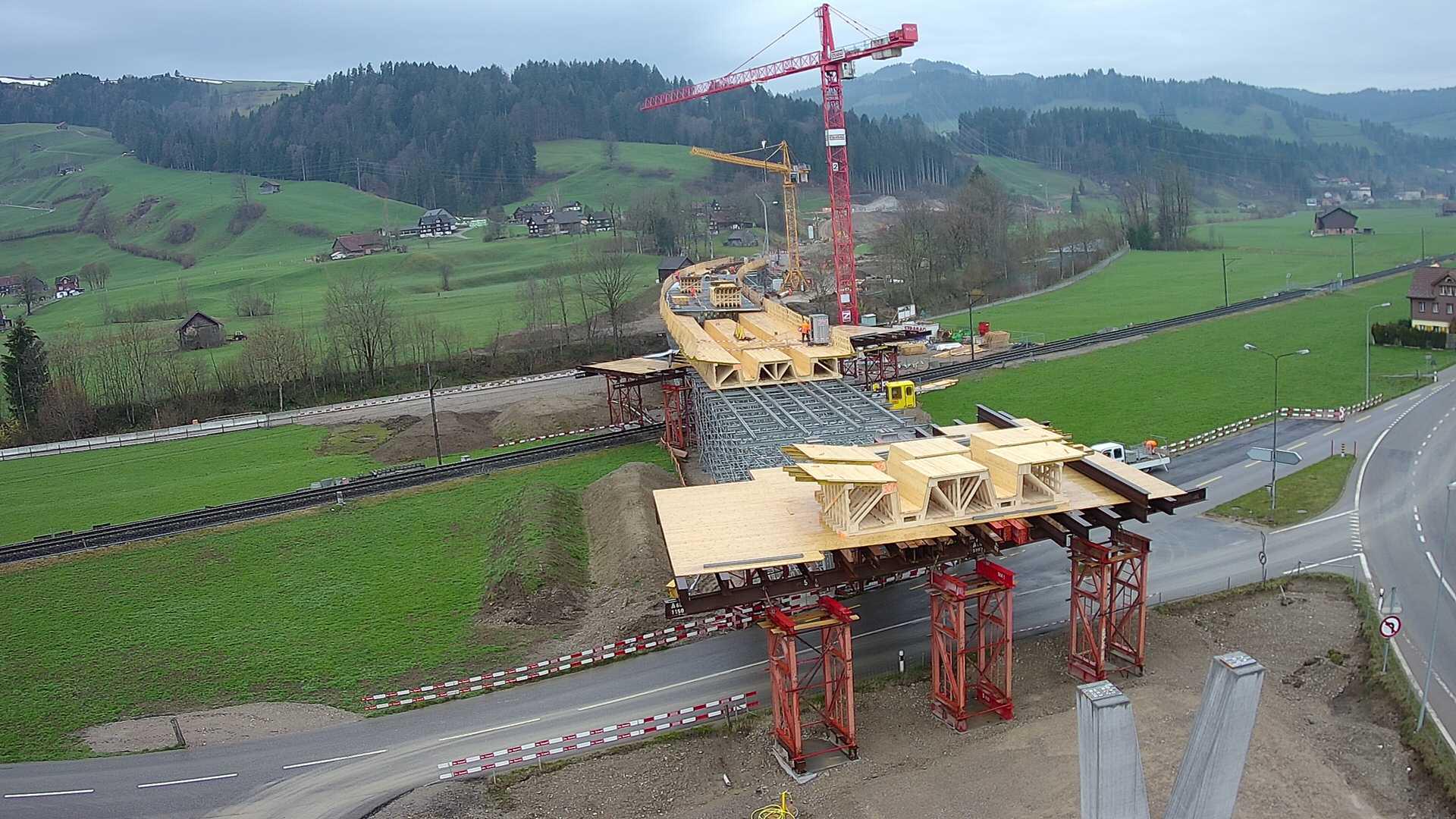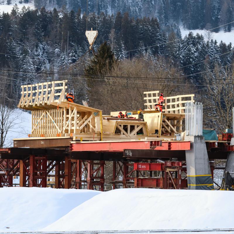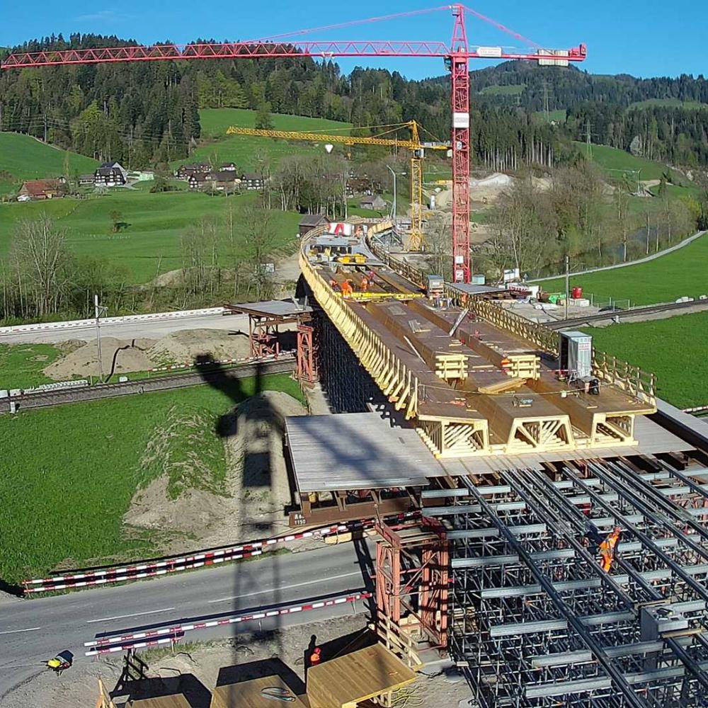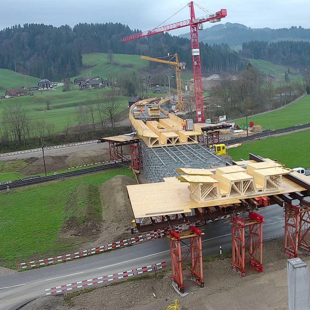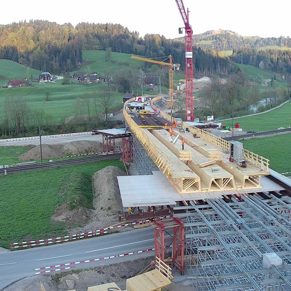 Umfahrung Wattwil die vorgespannte Stahlbetonbrücke wird mit vorgefertigten Holzelementen von der Strabag AG Abteilung Holzbau exakt gefertigt und montiert. Die Brücke ist ca 350m lang und im Grundriss gebogen. Die Brücke quert das Tal von West nach Ost.