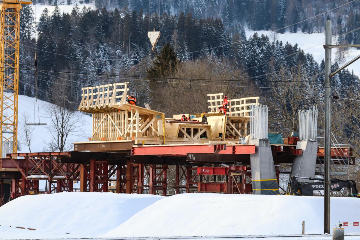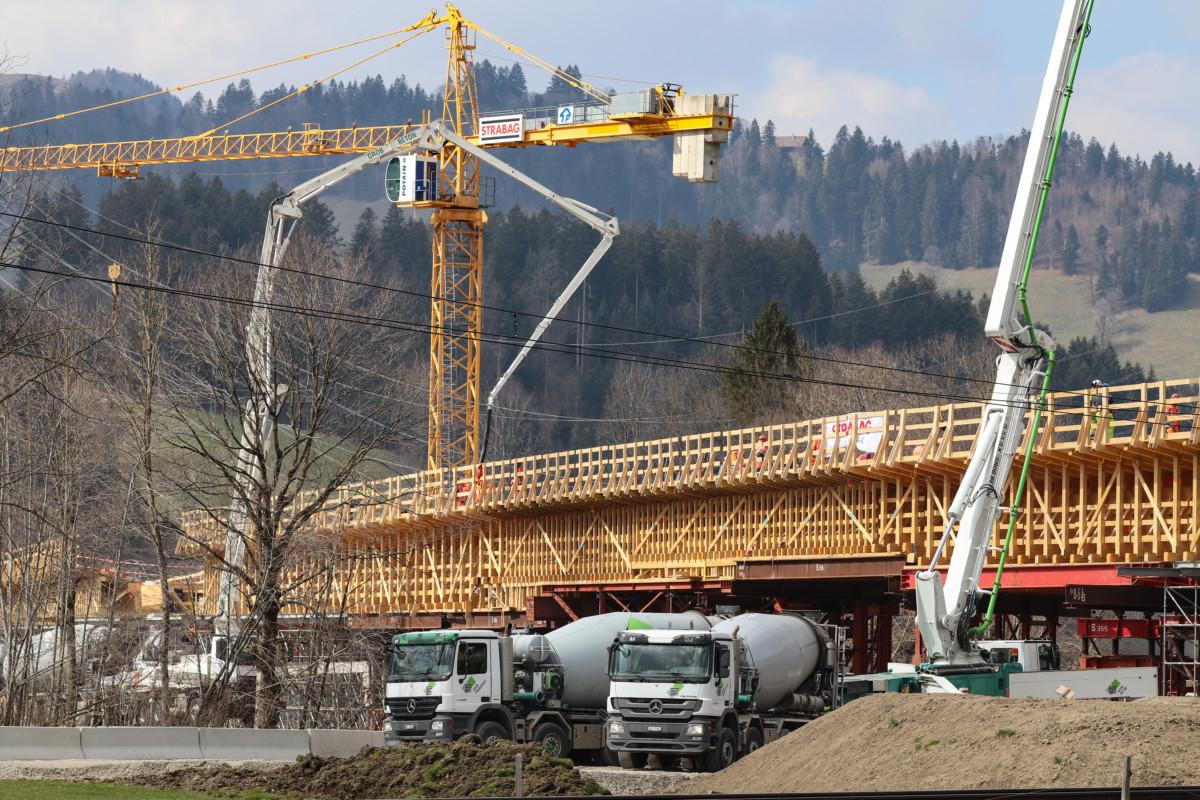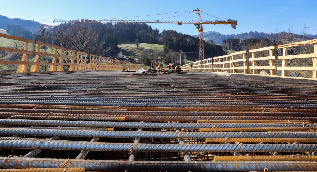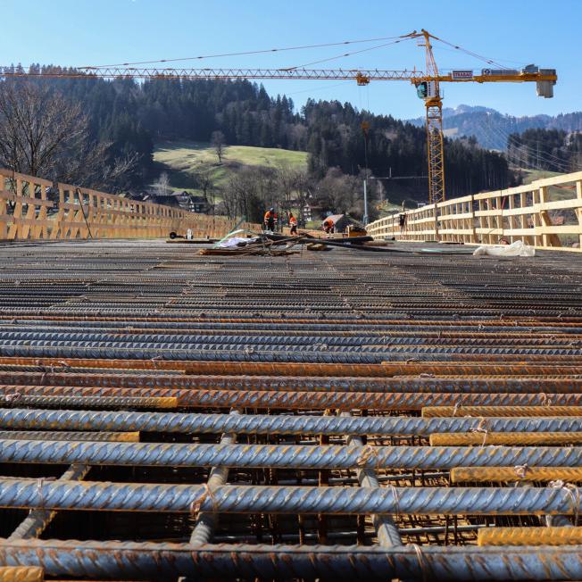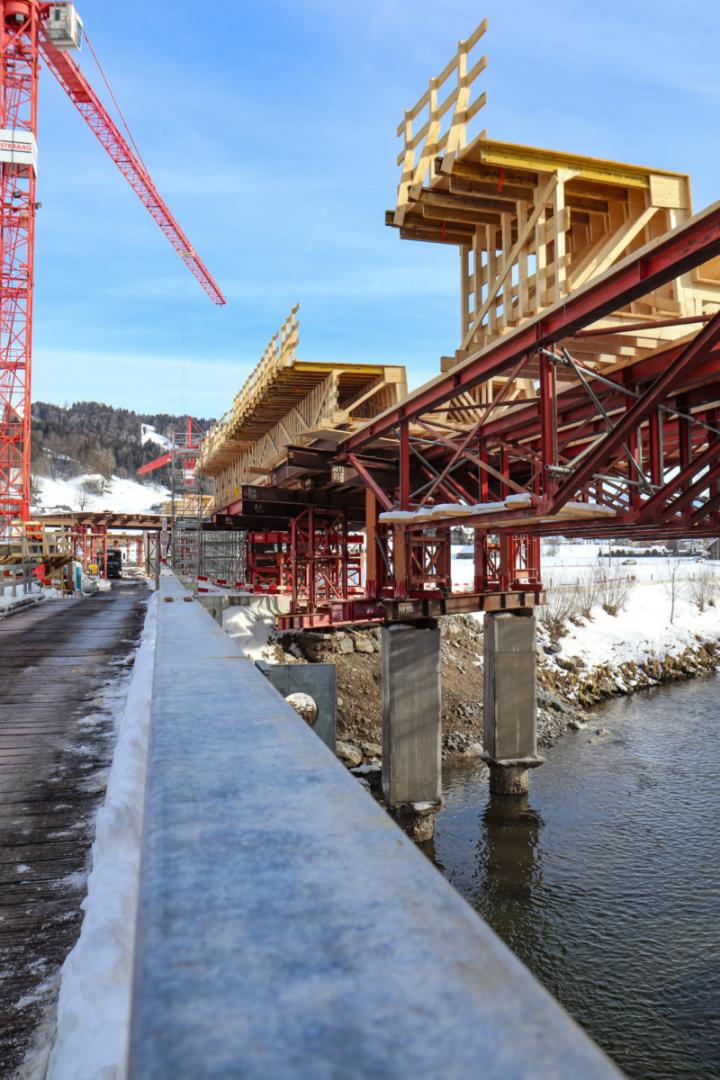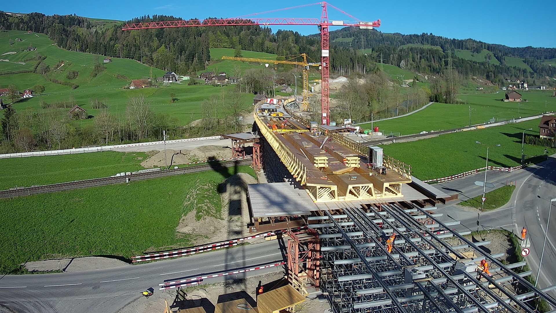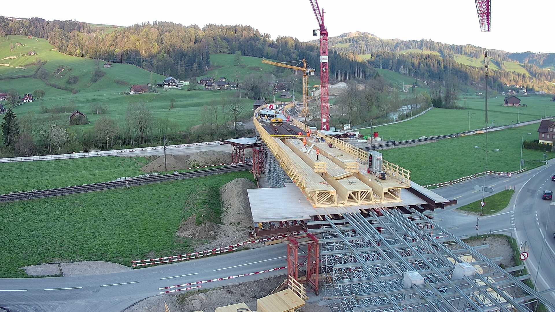 Umfahrung Wattwil die vorgespannte Stahlbetonbrücke wird mit vorgefertigten Holzelementen von der Strabag AG Abteilung Holzbau exakt gefertigt und montiert. Die Brücke ist ca 350m lang und im Grundriss gebogen. Die Brücke quert das Tal von West nach Ost.
